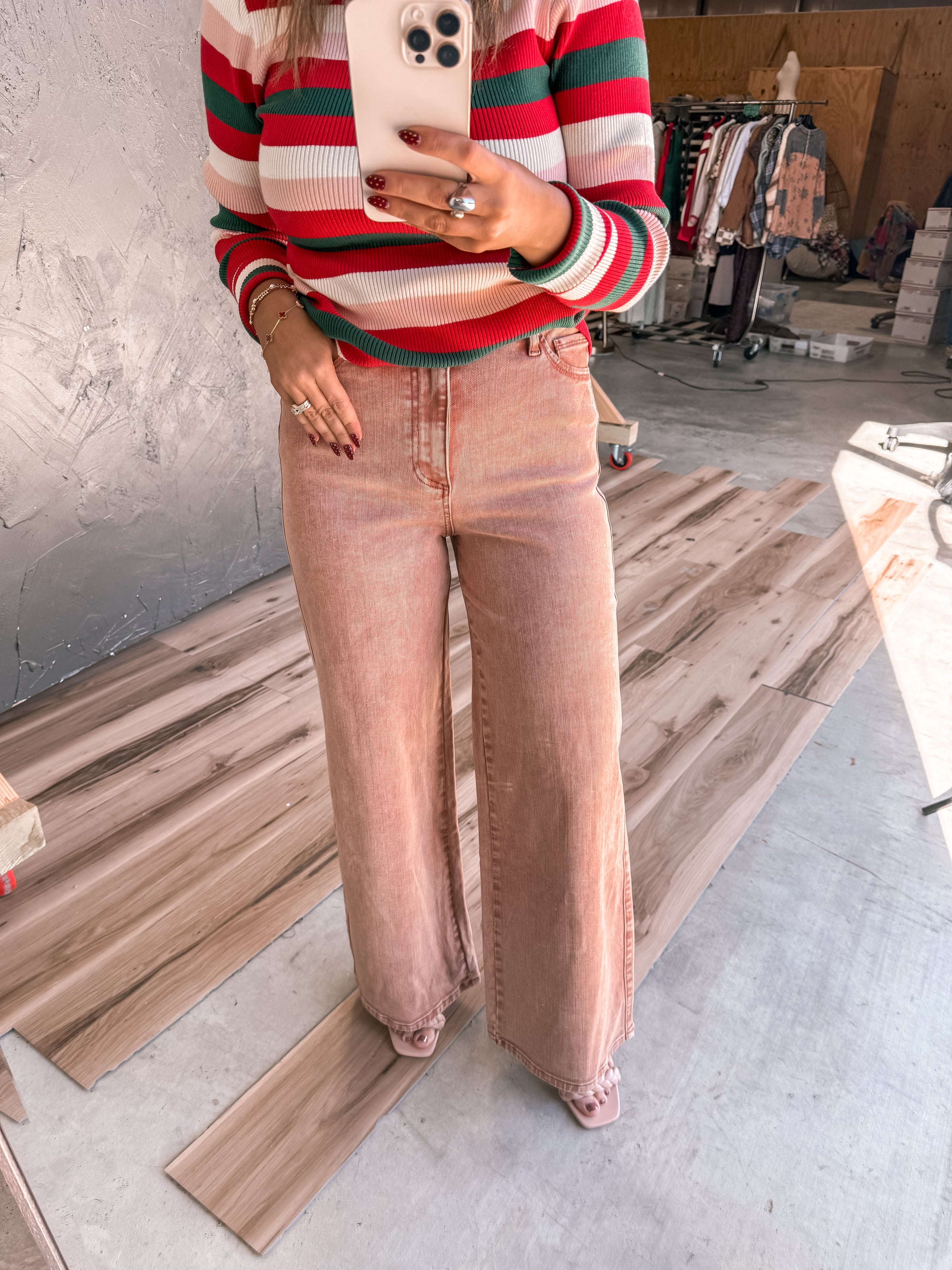 Spread holiday cheer in our Merry Denim—a vibrant red washed pair that's anything but basic. Crafted with super stretch fabric, these jeans move with you all day, whether you're dancing through festivities or running errands. The soft, faded finish gives off effortless cool-girl vibes, while the flexible fit keeps you comfortable from morning to night. Perfect for adding a pop of color to your seasonal wardrobe.