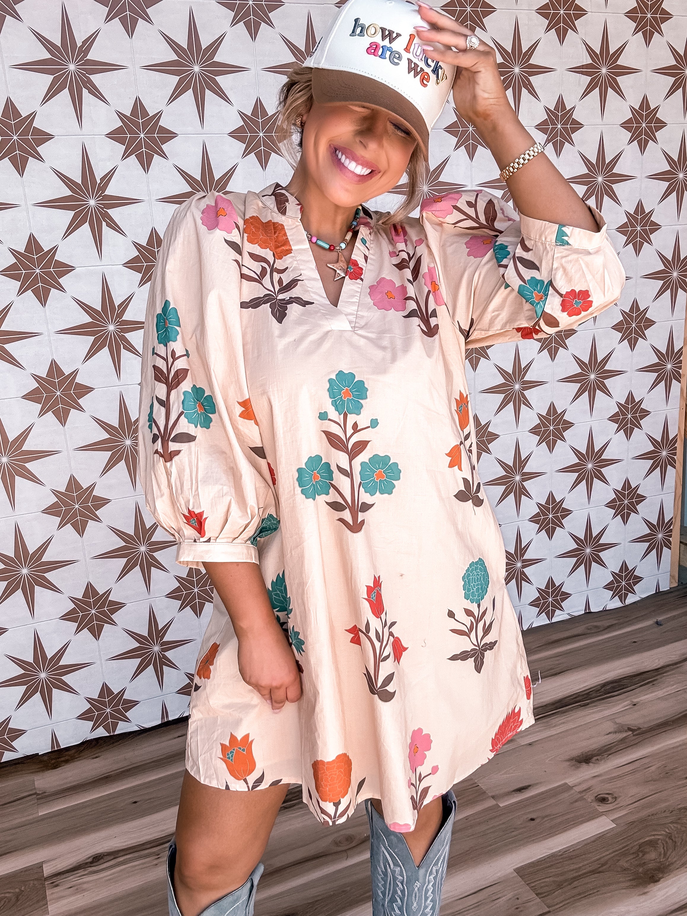Embrace effortless charm with the Daydreamer Dress in soft ecru. Its delicate floral pattern and flattering V-neck create a light, whimsical look that's perfect for sunny days and sweet adventures. Flowing and easy to wear, this dress lets you float through your day with playful grace..