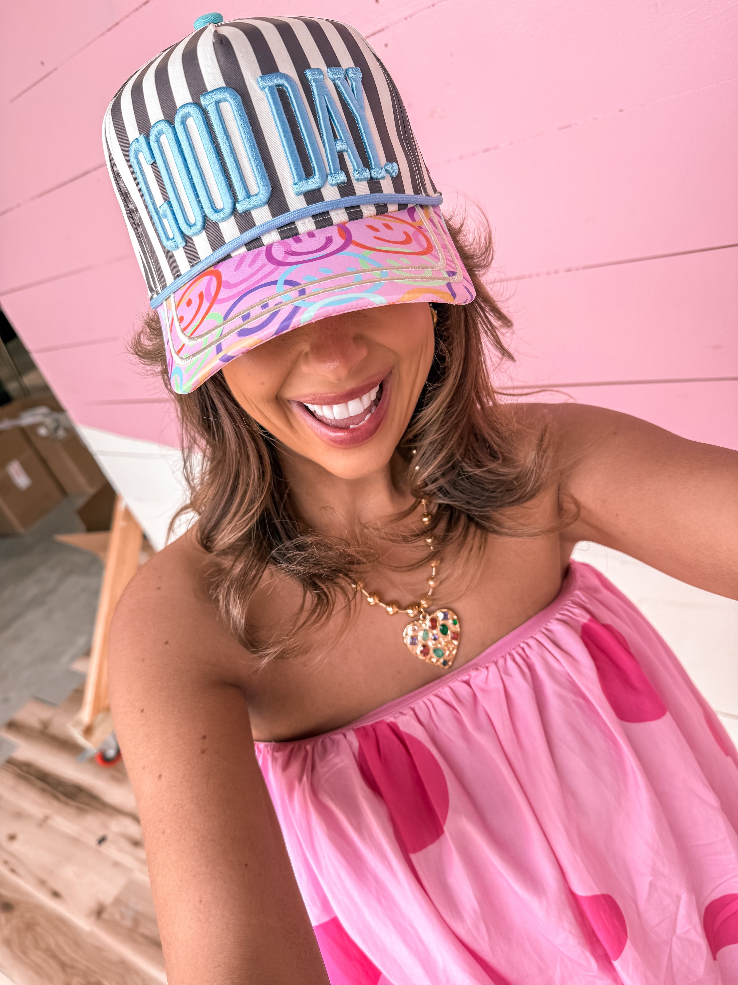 Rock a vibe that's equal parts retro and rebellious with this funky striped trucker hat. Bold color-blocked stripes wrap around the crown while classic mesh panels keep things cool and breathable. The structured five-panel design delivers that iconic trucker silhouette with an unexpected twist—perfect for anyone who refuses to blend in. Adjustable snapback closure ensures the perfect fit every time. Make a statement that says you've got style for days.