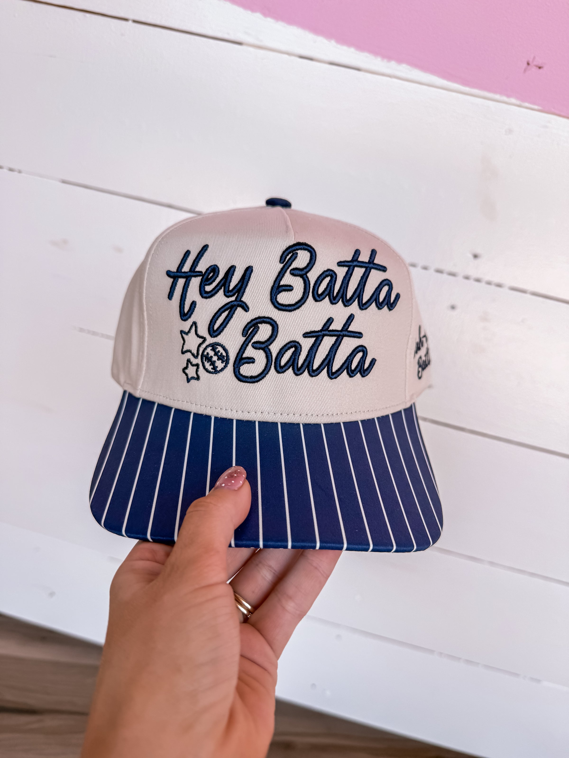 Strike a classic look with the Hey Batta Batta Hat, featuring a timeless navy stripe stitch design. Perfect for game day, casual outings, or everyday wear, this hat combines vintage charm with modern comfort. The detailed stitching adds character while the structured fit keeps you looking sharp. Whether you're cheering from the stands or heading out on the town, this versatile hat is your go-to accessory for effortless style.