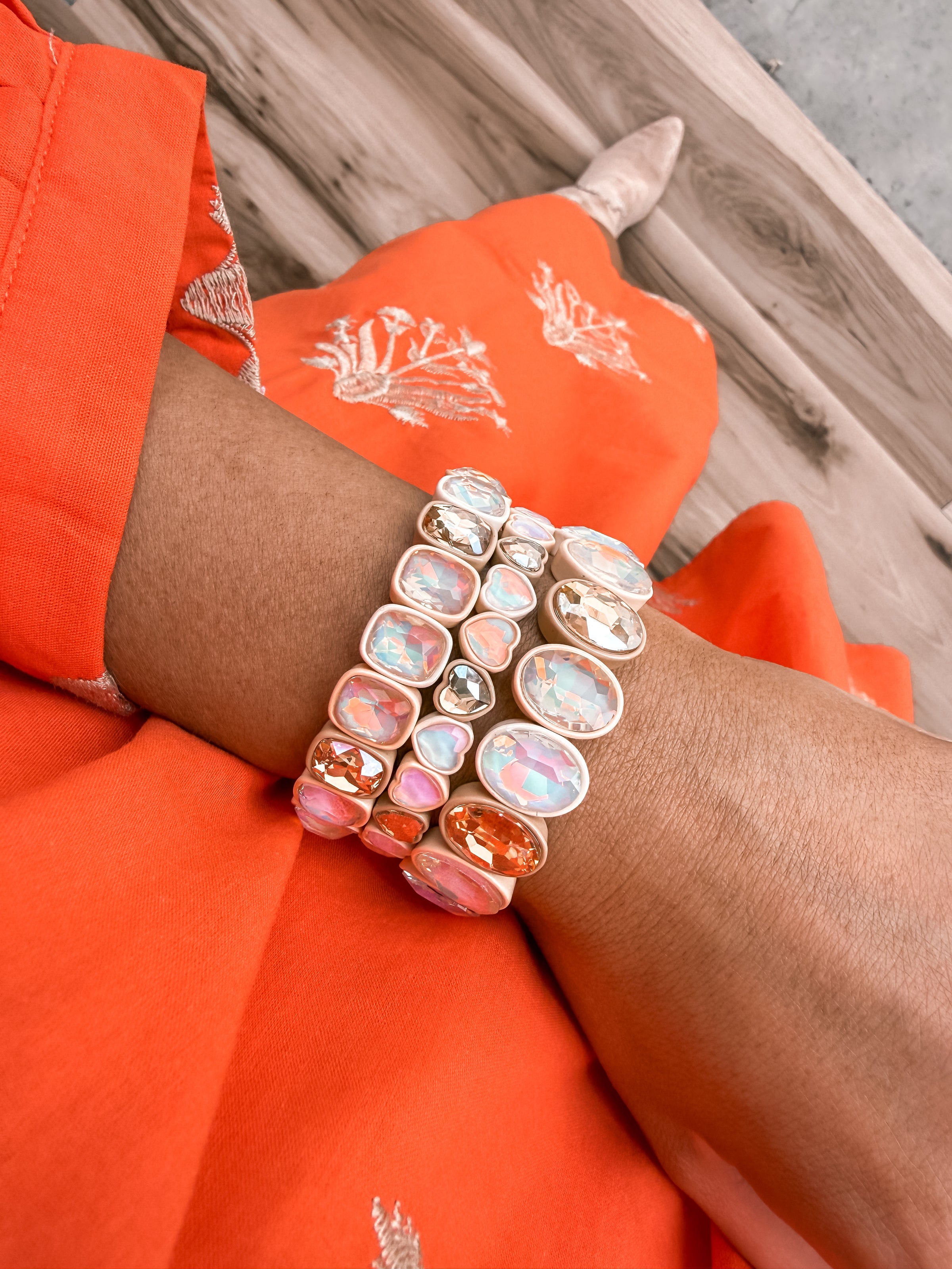 Elevate your everyday elegance with the Nude Heart Stack, a versatile bracelet set designed to layer beautifully on your wrist. This curated collection features soft, neutral tones paired with sparkling crystal accents that catch the light with every movement. Perfect for stacking or wearing individually, each piece complements any outfit while adding a touch of sophistication. Mix and match to create your signature look, whether you're heading to the office or out for the evening. A timeless addition to any jewelry collection.