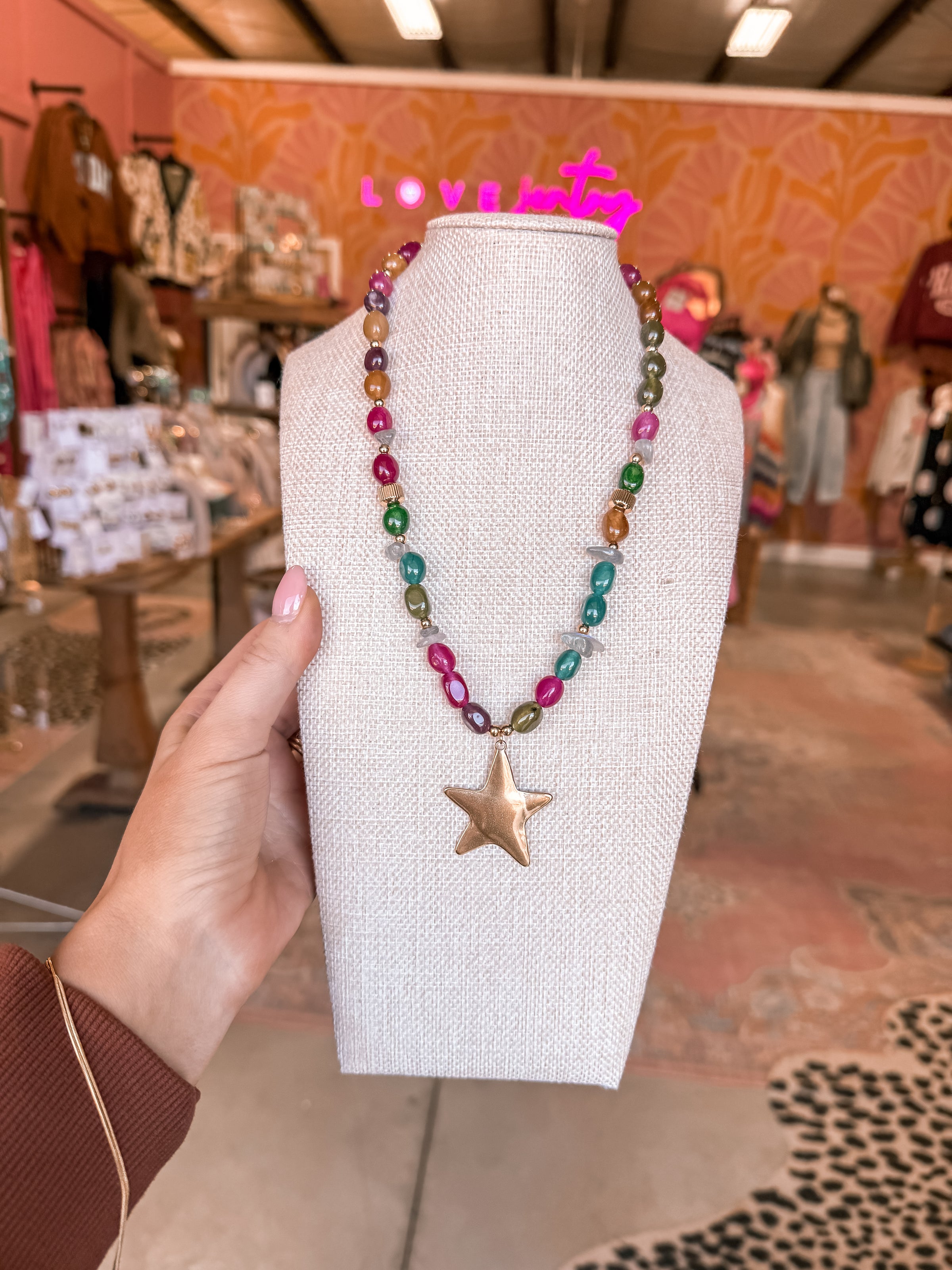 Reach for the stars with this enchanting beaded necklace that captures celestial magic in every sparkle. Delicate beads form a stunning star pendant that catches the light beautifully, making it the perfect accessory to elevate any outfit. Whether you're dressing up for a special occasion or adding a touch of whimsy to your everyday look, this necklace brings a little cosmic charm wherever you go. A timeless piece that reminds you to shine bright and embrace your inner sparkle.