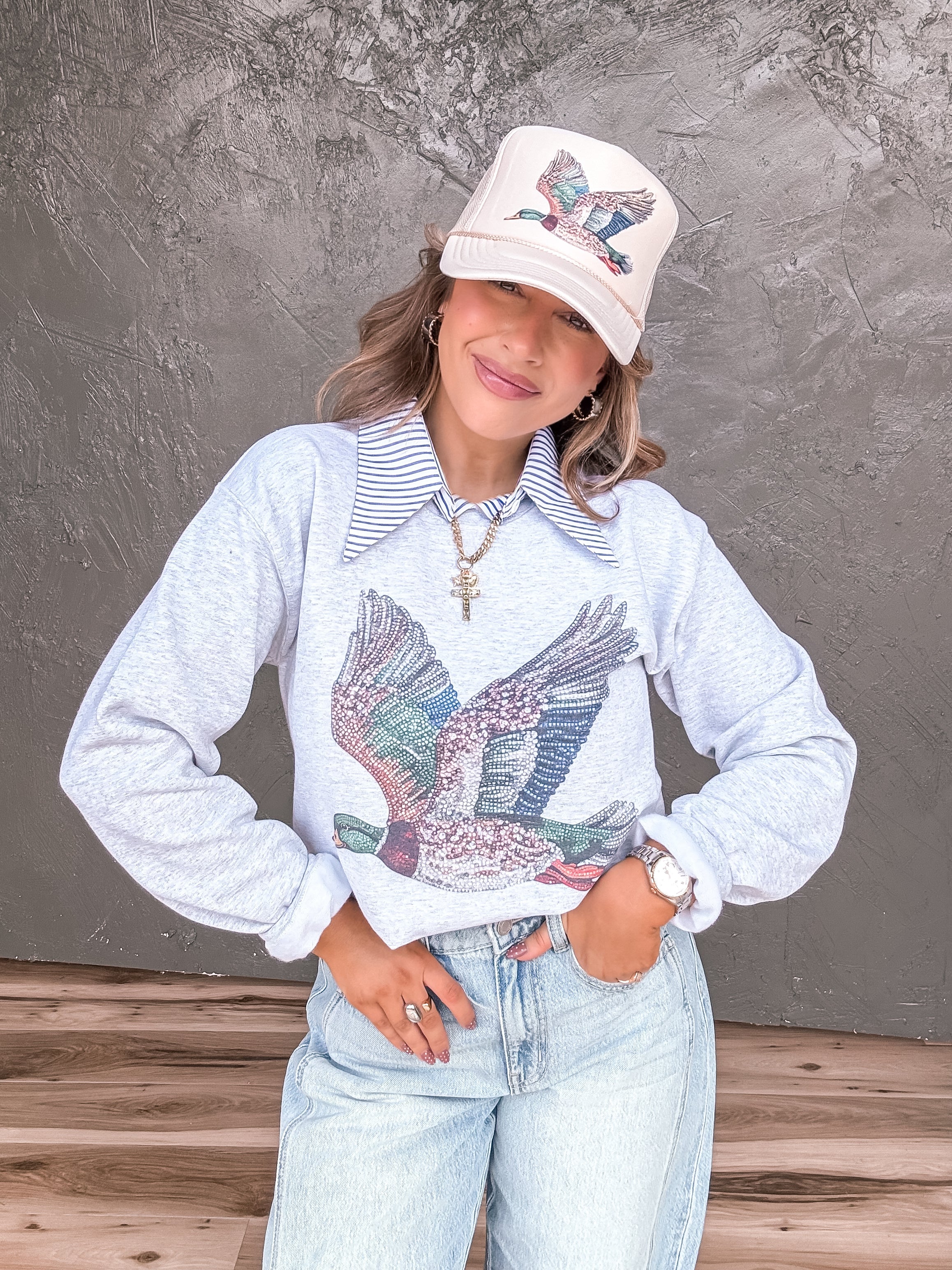 Waddle into style with this delightfully quirky crewneck sweatshirt featuring a bedazzled duck design that's sure to turn heads. Soft, cozy fabric keeps you comfortable all day long, while the eye-catching sparkly duck adds a fun, whimsical touch to your everyday wardrobe. Perfect for anyone who loves a little personality in their fashion choices. Whether you're lounging at home or out and about, this sweatshirt brings charm and comfort together in one adorable package.