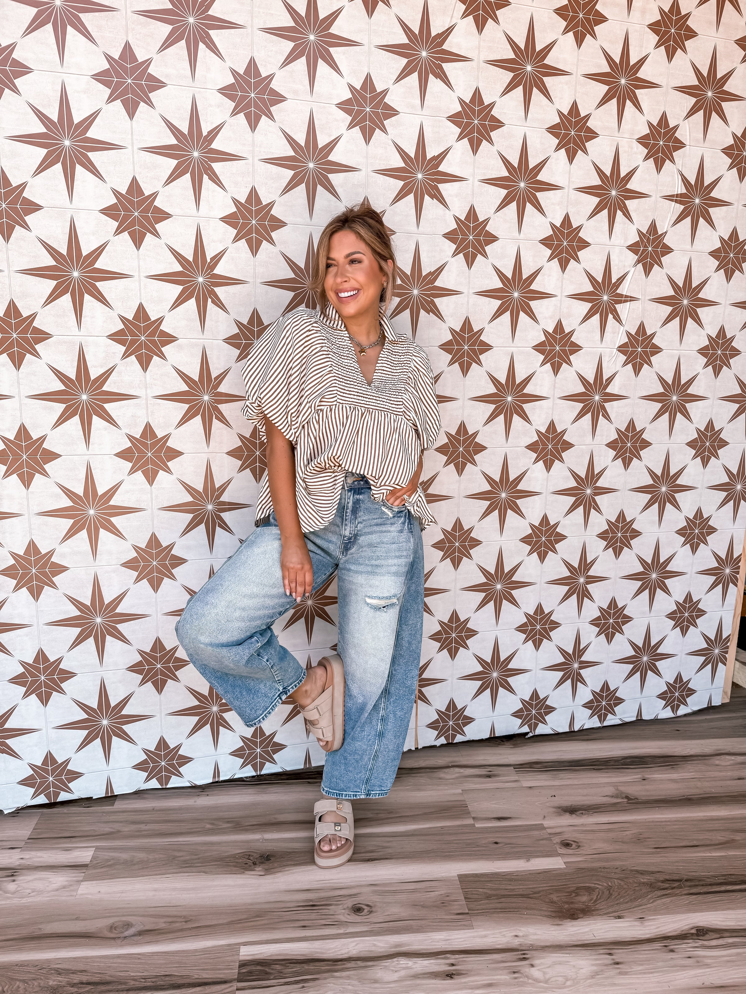 This Caramel Stripe Top features a playful v-neck and lively stripes that brighten up any outfit. Its soft, comfortable fabric makes it perfect for casual days or layering up, adding a fun twist to your everyday style.
