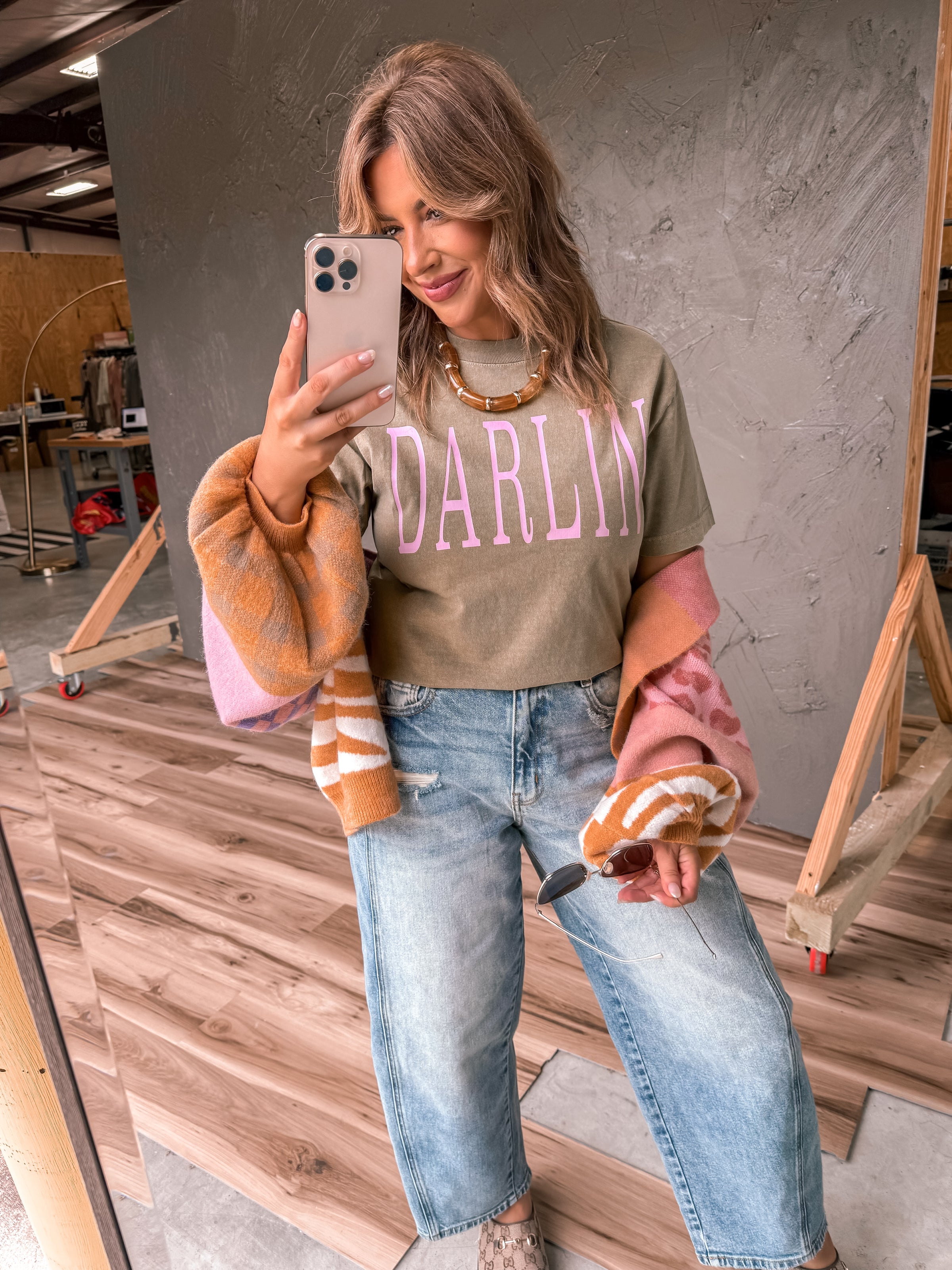 Slip into effortless style with the DARLIN' Tee—a laid-back olive essential that speaks volumes. Featuring eye-catching pink letters across the chest, this casual favorite pairs perfectly with everything from jeans to skirts. Soft, comfortable, and undeniably cute, it's the kind of tee you'll reach for again and again. Make a statement without trying too hard.