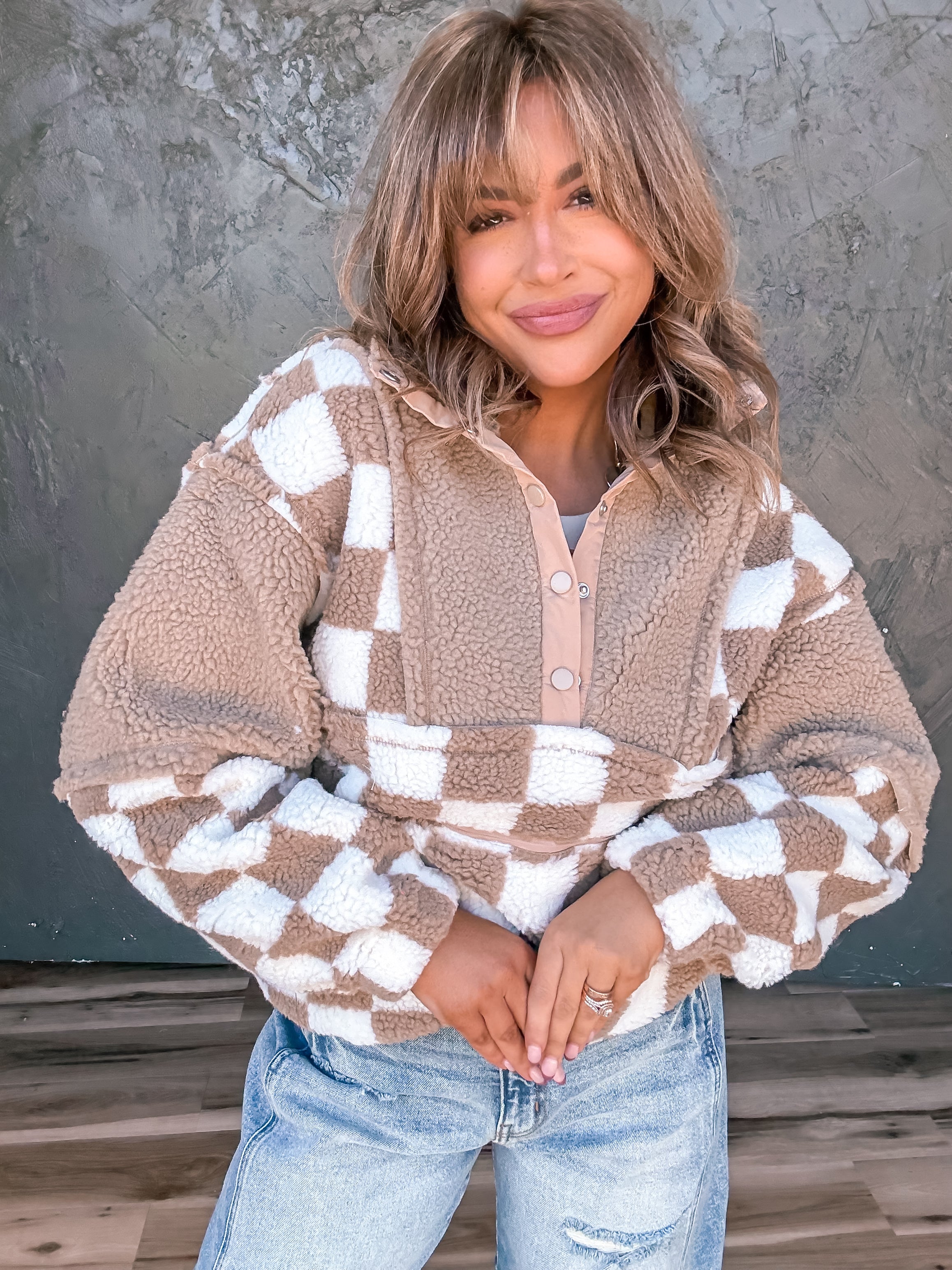 Wrap yourself in cozy comfort with the Keep It Real Fleece Pullover, featuring a charming taupe checkered pattern that's equal parts laid-back and stylish. This soft, snuggly pullover is perfect for those days when you want to keep it real—no fuss, just pure comfort. Whether you're lounging at home or running errands around town, this versatile piece pairs effortlessly with your favorite jeans or leggings. Stay warm, stay real, stay fabulous.