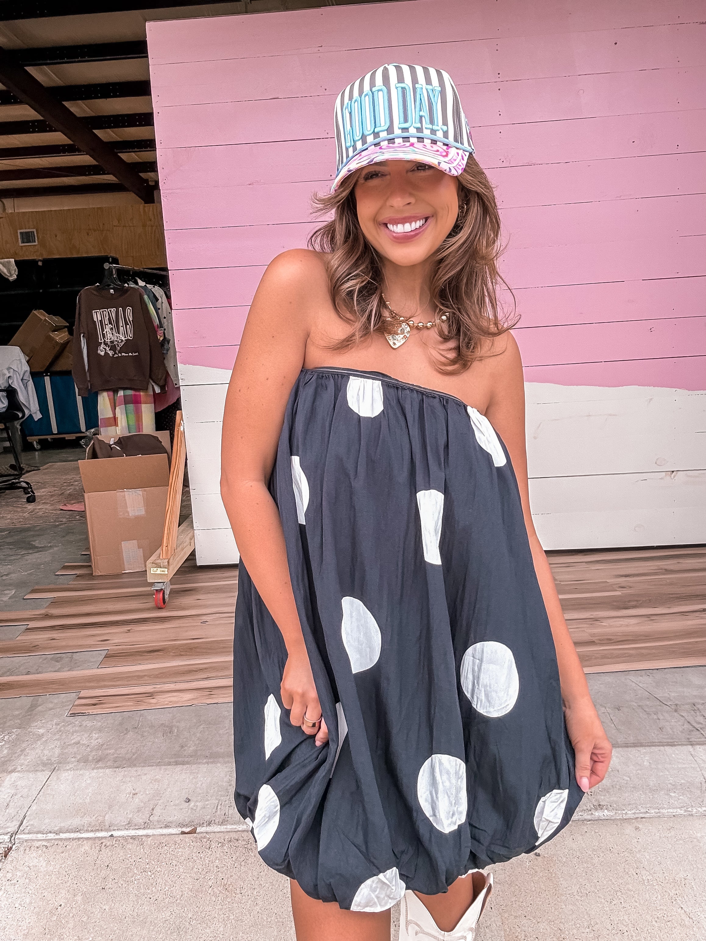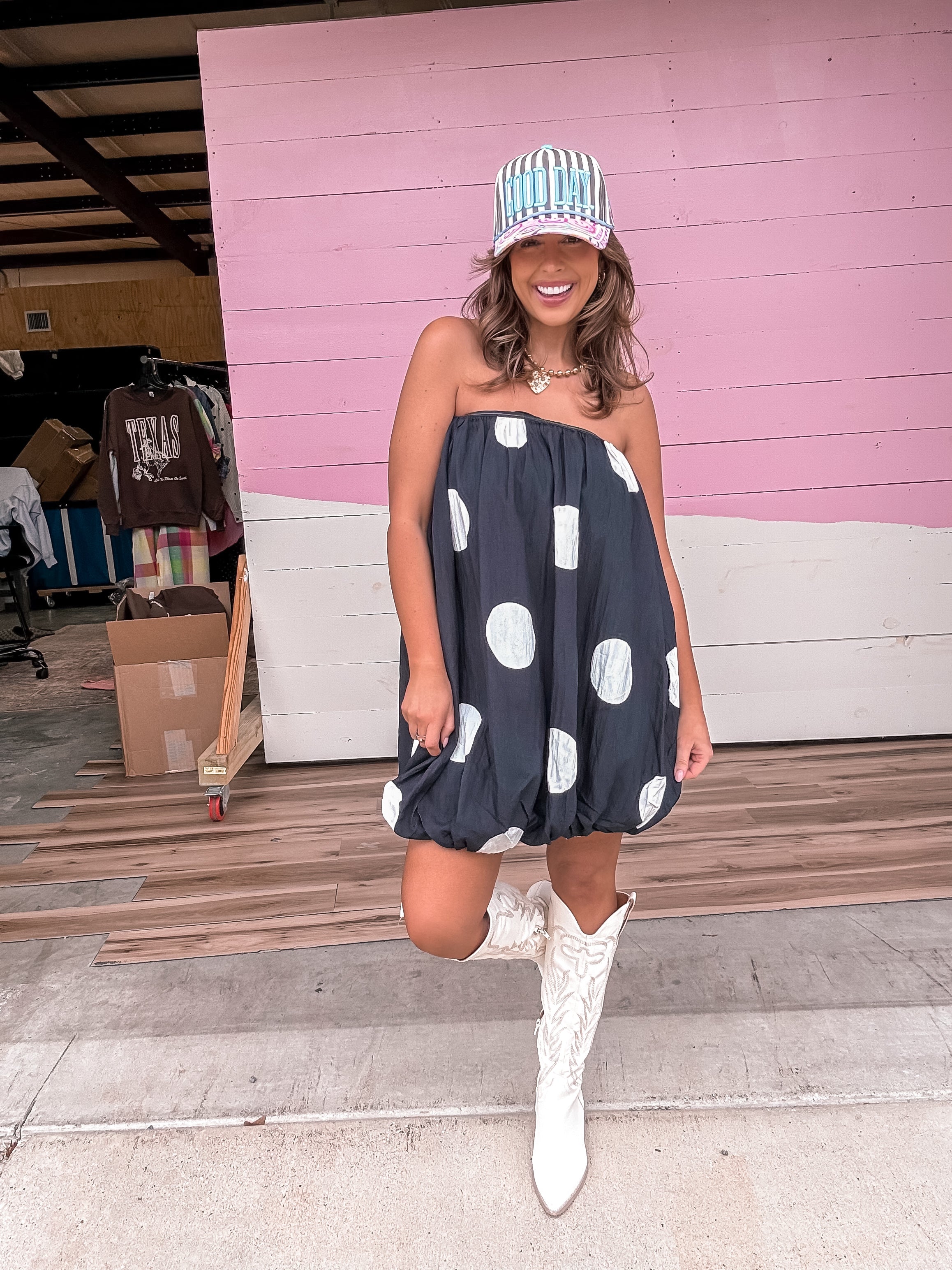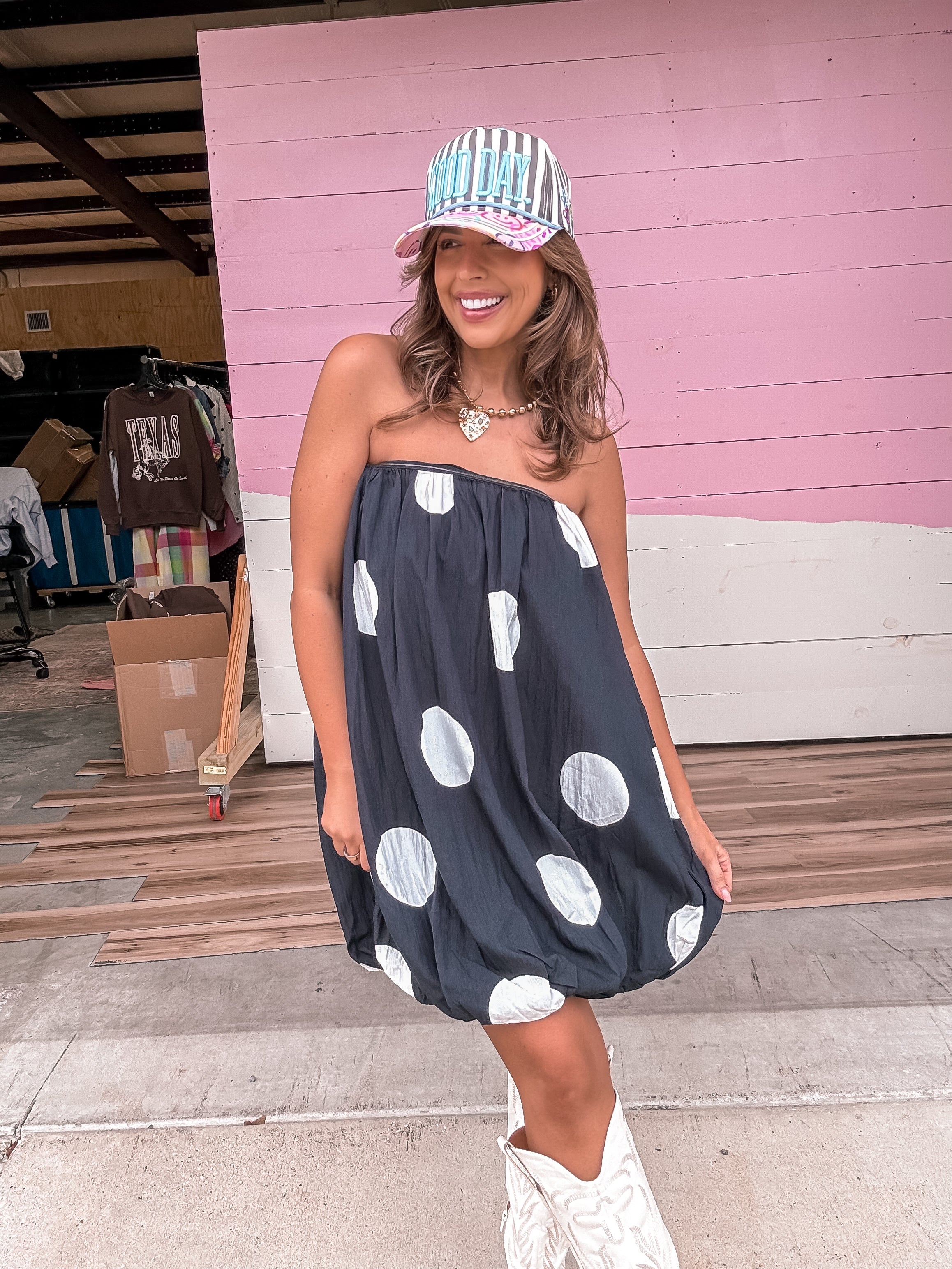 Twirl into the spotlight in this charming polka dot bubble dress! The classic black base paired with playful white dots creates an instantly cheerful look that works for everything from casual outings to special occasions. The bubble hem adds a fun, flirty silhouette that's both comfortable and eye-catching. Perfect for anyone who loves a touch of vintage-inspired style with modern flair. Make a statement without saying a word!