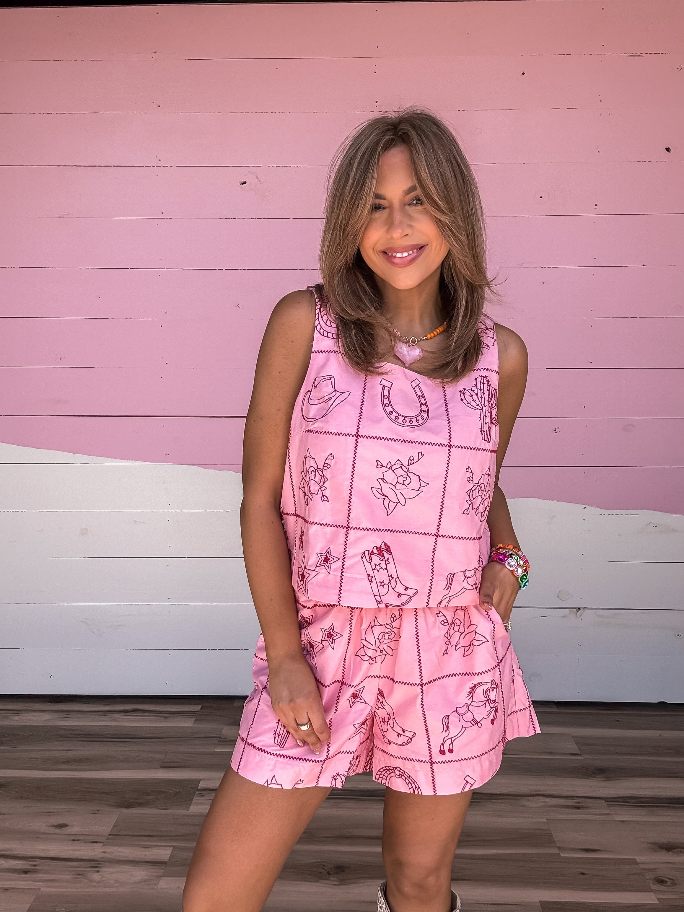 Saddle up in style with The Rodeo Set, featuring a pink embroidered western ensemble that brings playful charm to your wardrobe. This coordinated set combines classic western aesthetics with delicate embroidery details, perfect for ranch days, country events, or making a statement wherever you roam. Crafted for comfort and designed to turn heads, this set captures the spirit of the West with a modern, feminine twist.